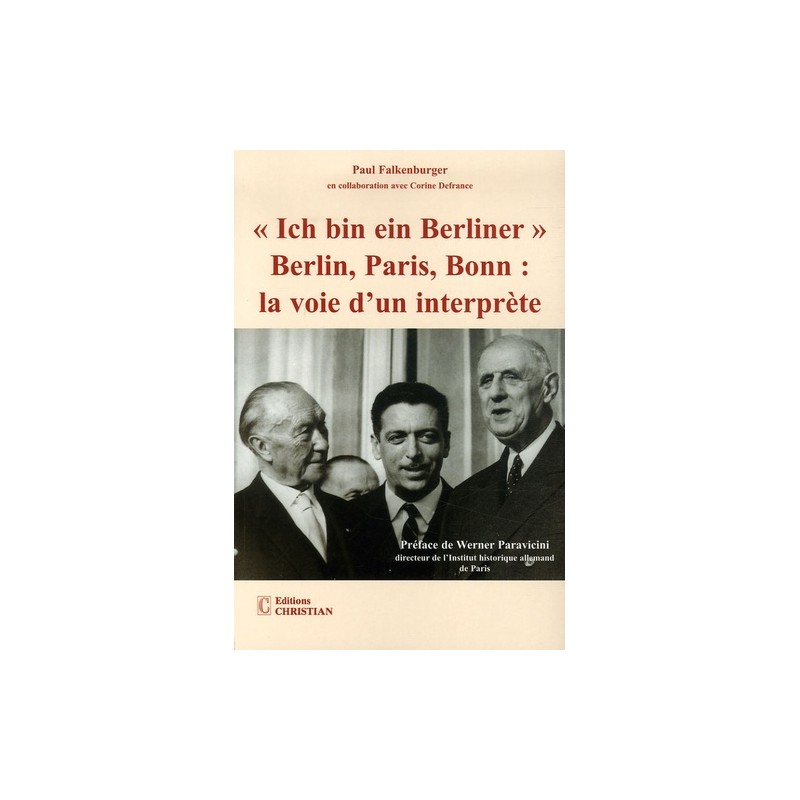 Ich bin ein Berliner, Berlin, Paris, Bonn, raconte la petite histoire à côté de la grande, vécue par un témoin attentif, un des seuls survivants ayant assisté à la plupart des relations entre la France et l'Allemagne dans l'essor économique à partir des années 60. Paul Falkenburger a connu trois présidents de la République, cinq chanceliers fédéraux allemands et leurs ministres des Affaires étrangères. Sans trahir les secrets d'État, il relate le passage de l'état " d'ennemis héréditaires " des Allemands à celui de " bons voisins ", consacré par le Traité de l'Élysée du 22 janvier 1963.